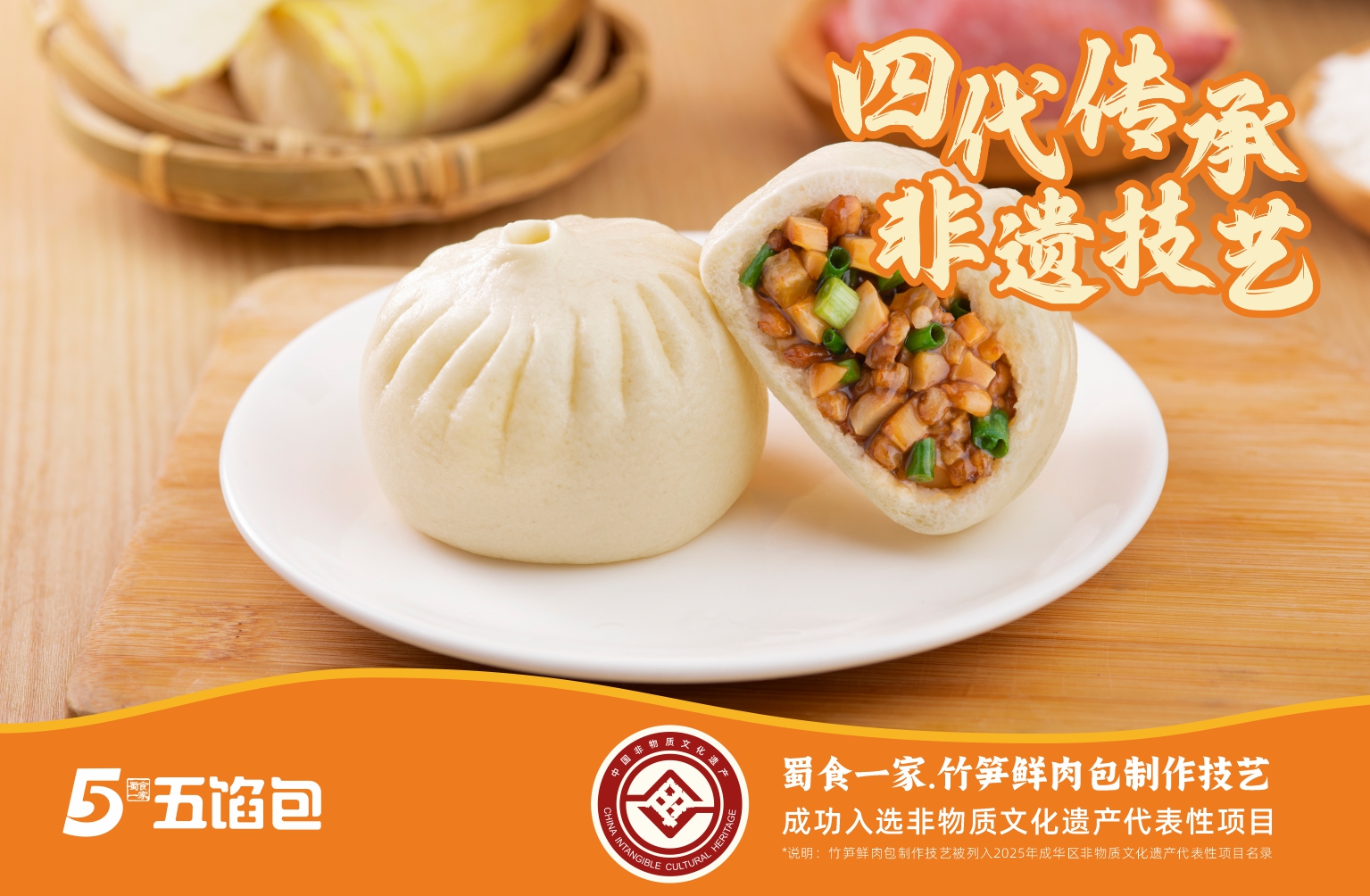 2025年12月,蜀食一家五馅包的[竹笋鲜肉包制作技艺],正式入选成都市成华区非物质文化遗产代表性项目名录。